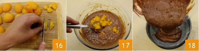 Finally, dab the apricots with a kitchen towel and cut them into small cubes 16, leaving aside 8 whole ones for decoration. Add the chopped apricots to the mixture and mix 17; then flour and line a 9-inch diameter cake pan with parchment paper. Pour the mixture inside 18 and spread it with a spatula.