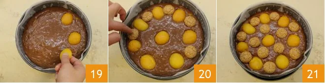 Then gently place the apricots on the surface, concave side up 19. You can space them slightly and place 7 on the edge and one in the center. You must leave space for the 12 amaretti, which you can alternate with the apricots 20. Once finished 21, bake the cake in a preheated static oven at 350°F for 45 minutes (320°F for about 35 minutes if using a convection oven).