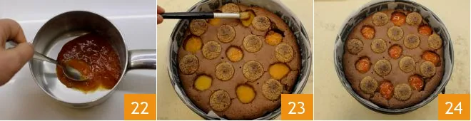 Meanwhile, melt the apricot jam over very low heat 22: when the cake is ready, take it out of the oven and while still hot, brush the jam over the apricots with a brush 23. The chocolate cake with apricots and amaretti is ready to be served 34!