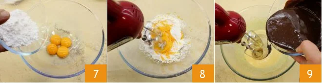 and whip the yolks with two-thirds of the powdered sugar 7: you can use an electric beater 8 or a hand whisk. Then pour in the melted, cooled chocolate and continue to work the mixture 9.