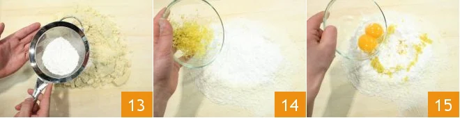 Pour the obtained sanding on a work surface and add the sifted powdered sugar 13. Create a fountain shape and pour the grated lemon zest 14 and the egg yolks 15 in the center.