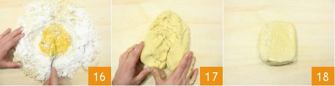 Then start mixing everything first with a fork 16, then when the eggs have absorbed the flour well, you can continue by hand 17. Knead briefly, just enough to compact the dough, to prevent the pastry from heating too much with the warmth of your hands and remaining crumbly. Form a dough ball and flatten it before wrapping it in plastic wrap 18;