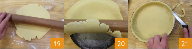 place it in the refrigerator to firm up for at least 30 minutes. After 30 minutes, roll out the shortcrust pastry with a rolling pin to a thickness of about 1/2 inch 19, then place the dough in a 9-inch diameter mold 20, remove the edges protruding from the mold 21,