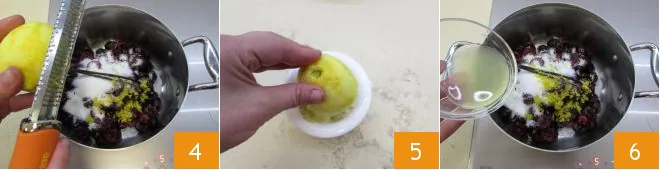 the whole bean, and the grated zest of one lemon 4. Then squeeze the lemon 5, strain the juice, and pour it into the pot 6.
