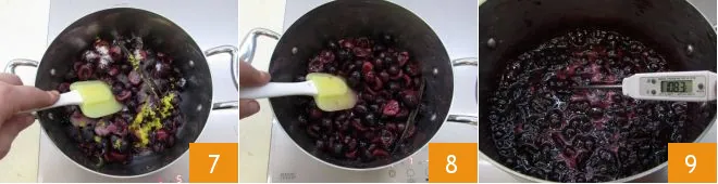Mix the mixture with a spatula 7, and let it cook over medium heat until it boils. Then take a bit of the cherry liquid from the pot, dissolve 5 g of agar-agar in it, and add it to the mixture to achieve a thicker consistency. At this point, lower the heat and let it cook for at least 40 minutes 8, stirring occasionally, until it reaches a temperature of 226°F using a kitchen thermometer 9.
