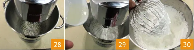 and whip them at medium speed 28. When the syrup reaches 250°F, lower the speed of the mixer (to avoid syrup splattering on the walls of the bowl), pour half of the syrup into the egg whites 29 and then increase the speed again. Wait a few seconds, then continue pouring the syrup in a thin stream and whip until the meringue cools completely. The obtained meringue should be very dense, smooth, and shiny 30,