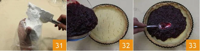so once ready, transfer it to a piping bag with a star nozzle 31. Take the baked shortcrust, pour the now lukewarm cherry compote over it 32 and level it well 33.