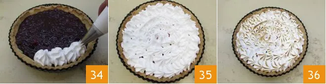 Decorate with the prepared meringue 34 until covering the entire surface of the cake 35 and bake for 3-4 minutes at 464°F, just enough to brown the meringue. Your meringue cherry cake is ready to be enjoyed 36!