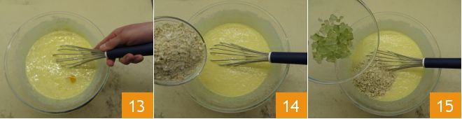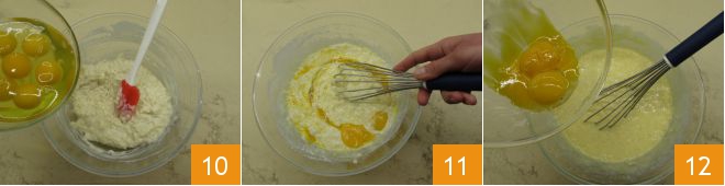 and whole eggs 10. Stir with a whisk 11, then add the egg yolks 12