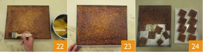 At this point, brush the hot cake with the syrup just prepared 22 to soak it evenly 23. Cut the Celebration Cake into squares before serving 34!