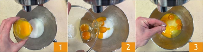 To prepare the birthday cake, start with the sponge cake: in the bowl of a stand mixer fitted with whisks, add the sugar, egg yolks 1, whole eggs 2, and a pinch of salt 3.