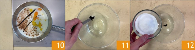In the meantime, work on the custard: in a saucepan, heat the milk with orange and lemon zest, cinnamon, and the vanilla pod 10. Collect the seeds in a bowl 11 and add the granulated sugar 12.