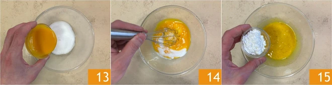 Add the egg yolks 13, mix 14, and add the rice starch 15.