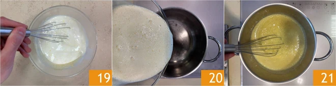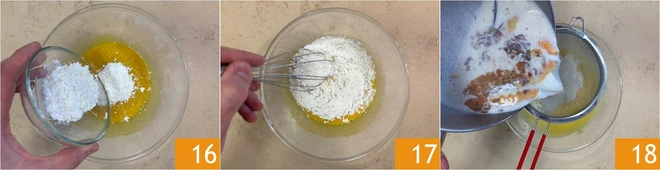 Add the corn starch 16 and mix again to obtain a homogeneous batter 17. Finally, pour the now hot milk into the bowl, straining it through a sieve 18.