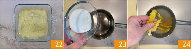 Once ready, cool the custard immediately by pouring it into a cold bowl from the freezer, then transfer it into a dish 22 and let it cool in the fridge for 3 hours covered with plastic wrap in contact with the surface. In the meantime, you can take care of the syrup: in a saucepan, pour water, sugar 23, and orange and lemon zest 34.