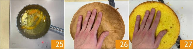 Bring to a boil and let it infuse until it cools down 25. Once cooked and cooled, retrieve your sponge cake: with a serrated knife, peel off the outermost part 26 and then cut it in half to obtain 2 discs 27.