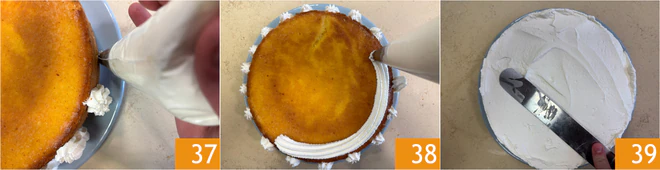 Now, with the remaining whipped cream, distribute dollops all around the cake border 37 and cover the surface 38. Carefully smooth everything out to obtain a smooth and tidy coating 39.