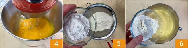 Turn on the whisks and let them work for at least 10 minutes 4, until the mixture is very light and foamy. Meanwhile, sift together the flour and potato starch 5 twice. Then pour the powders little by little into the whipped mixture 6.