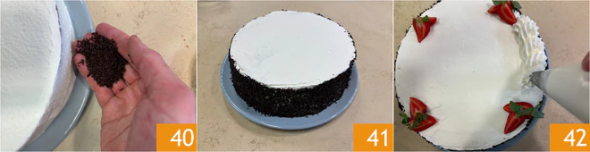 With your hands, let the chocolate sprinkles adhere to the entire cake border (40-41), arrange the strawberries, and use the remaining whipped cream to garnish the surface of the birthday cake, forming a garland 42.