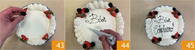 Add the berries as well 43, and with melted dark chocolate placed inside a parchment paper cone, write your dedication for the birthday person 44. Your beautiful birthday cake is ready; let it set in the fridge for at least 2 hours before serving.