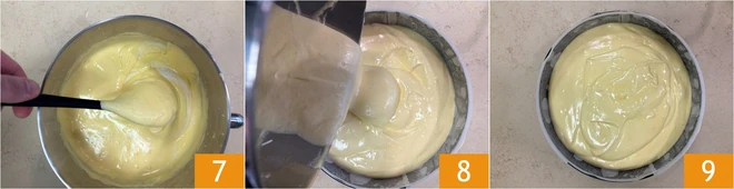 Gently mix with a spatula with upward movements from bottom to top 7. Once the powders are well incorporated, pour the obtained batter into a 10-inch greased pan lined with parchment paper 8. The sponge cake is ready to be baked 9 in static mode in a preheated oven at 350°F on the lowest rack. Bake for 30-35 minutes, and once removed from the oven, flip it over, remove the pan, and let it cool upside down.