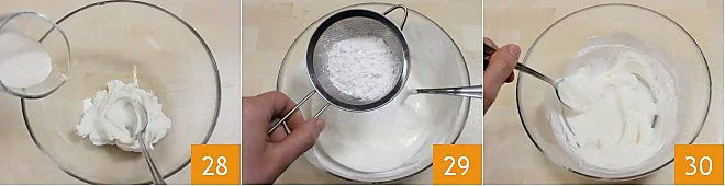 When you have finished the layers, move on to preparing the cream for the garnish: in a bowl, put 100 g of Greek yogurt and dilute it with fresh liquid cream 28; then add the sifted powdered sugar and mix with a spoon until you obtain a fluid cream 30.