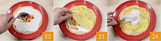 Add a tablespoon of fruit cubes 22 and distribute them over the entire surface, then cover the layer with another crepe 23. Then spread this crepe with about 2 tablespoons of strawberry cream 34 and distribute the fruit cubes as for the previous layer.
