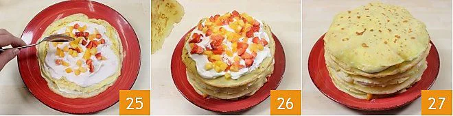 Then proceed in the same way (25-26), alternating the yogurt and strawberry creams until you finish the cake composition with the last crepe layer 27.