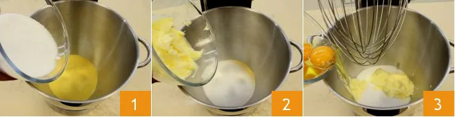 To prepare the corn cake (Bolo de fubá), make sure to remove the butter and eggs from the refrigerator two hours before starting to make the cake. Once they are at room temperature, pour the cornmeal and sugar into a stand mixer 1, then add the butter (which you have left out of the fridge for a couple of hours) now softened 2 and the whole eggs at room temperature 3.