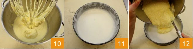 continue mixing until you obtain a frothy and homogeneous mixture 10. Then butter and line a 9-inch cake pan with parchment paper 11, then gently pour the mixture you have obtained into it using a spatula 12.