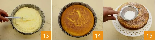 Using the spatula, spread it evenly in the pan 13 and finally bake in a preheated static oven at 356°F for 60 minutes (or in a convection oven at 320°F for 50 minutes); after the first 20 minutes of baking, cover the surface of the cake with aluminum foil, to prevent it from burning, and then finish baking. Once ready, take it out of the oven and let it cool 14. Sprinkle the corn cake (Bolo de fubá) with powdered sugar to taste and serve 15.