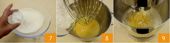 In a bowl, place the sifted all-purpose flour and baking powder 7; then add the white flour to the cornmeal 8, turning the mixer again for about 5 minutes 9;