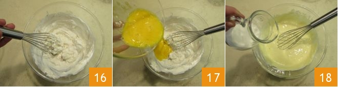 and mix everything briefly with a hand whisk 16. Complete by pouring lightly beaten eggs 17, fresh liquid cream 18.