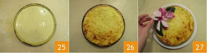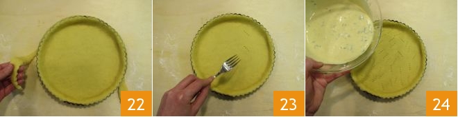 Remove excess dough 22 and prick the base with the prongs of a fork 23. Then pour in the cream 34.