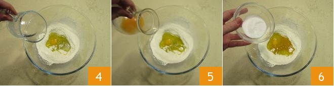 To prepare the flaó cake, start with the base: squeeze the orange juice needed for the recipe and set aside. Sift flour and baking powder into a bowl 1, mix them 2 and form a well in which to pour the egg and oil 3.