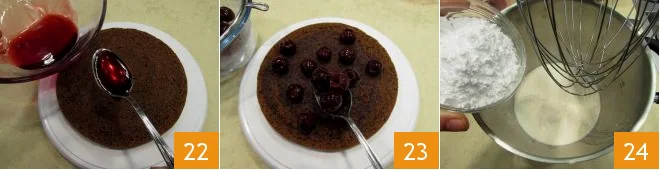 Take the first disc and place it on a rather large serving plate, then soak it with part of the cherry syrup you set aside 22, then arrange some of the cherries on the surface 23. Then prepare the Chantilly cream, whipping the cream together with the powdered sugar 34;
