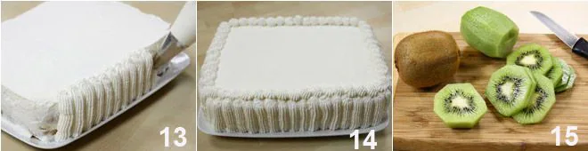 Then, place the remaining chantilly cream inside a piping bag fitted with a star nozzle and begin decorating the cake by making vertical piped lines on the sides 13; complete with blobs of chantilly cream on top of the piped lines along the entire perimeter of the cake. Then proceed with the fruit decoration, clean and peel the kiwis, and slice them into pieces about 1/8 inch thick 15.