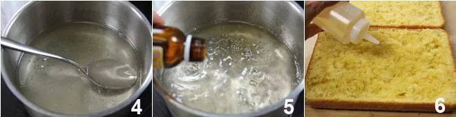 In a saucepan, dissolve the sugar in water to form a syrup 4, and when it reaches a boil, let it cook for 2-3 minutes, then turn off the heat and add the alchermes (or your preferred aroma) 5. Let the syrup cool and then moisten the two halves of the cake on the cut side 6;