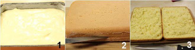To prepare the Italy cake, start with the preparation of the classic sponge cake. Using a hand mixer, a food processor, or a stand mixer, beat the eggs with the sugar for a long time, then add the sifted flour and potato starch. To see detailed preparation steps Sponge cake. Butter and flour a rectangular mold measuring 8 by 10 inches and pour the batter inside 1; bake in a preheated static oven at 350°F for 30-35 minutes. The sponge cake will be ready when it detaches from the edges and when a toothpick inserted into the cake comes out completely dry. Once the sponge cake is cooked, let it cool and remove it from the mold. Cut the sponge cake in half using a long-bladed knife (2-3).