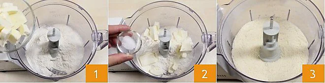 To prepare the rustic potato and onion pie, start with the shortcrust pastry, if necessary, you can consult the procedure Easy Shortcrust Pastry. Pour the flour into the blender and add the cold butter from the fridge in pieces 1. Then add the salt 2 and activate the blender to obtain a sandy mixture 3.
