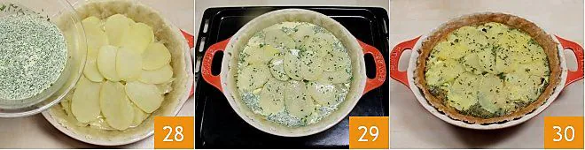Then start assembling your rustic pie: place a layer of onions on the pastry 25, then add the potato slices and continue alternating the layers until all the ingredients are used up (26-27). Finish with the potato layer.