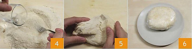 Pour the mixture onto a cold surface and form the classic well in the center, where you will start pouring water little by little, mixing with a fork to gradually gather the flour from the edges 4. Then knead everything quickly until you get a compact and fairly elastic dough 5. Form a dough ball and wrap it in plastic wrap 6, then place it in the fridge for at least 30 minutes.