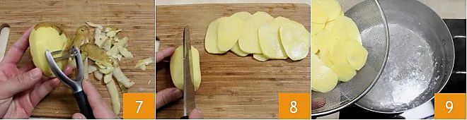 While the dough rests, proceed to prepare the pie filling: wash the potatoes thoroughly under running water and peel them with a peeler or a small knife 7, then cut them into slices about 1/8 inch thick 8. In a large pot, bring the water to a boil, salt it, and immerse the potato slices 9.