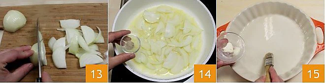 Now wash the onions, remove the outer layer, and cut them into slices about 1/8 inch thick 13. In a large pan, place the butter in pieces and melt it over low heat, then soften the onions over low heat for 5-6 minutes, then add salt and pepper 14, turn off the heat, and set aside. Prepare a 10-inch diameter pie pan for baking the pie: first, carefully brush the surface and edges of the pie pan with a bit of butter 15.