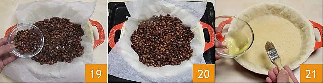 Now you can proceed with the blind baking of the shortcrust pastry (for this procedure, you can consult the cooking school: how to blind bake) which will enhance the crispness of the base: line the shortcrust pastry with a sheet of parchment paper and then cover it with dried beans (or other dried legumes) 19. Place the pie pan in a preheated static oven at 350°F for about 20 minutes (if using a fan oven, at 320°F for 10-15 minutes) 20. After the necessary time, remove the pie pan from the oven, remove the paper with the legumes, and let it cool slightly. Brush the bottom of the pastry with egg white 21 and put back in the oven for another 5 minutes at the same temperature. Then remove the pie pan from the oven.
