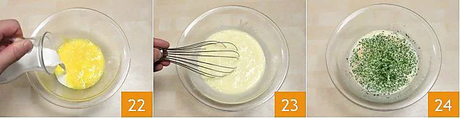 While the base cools slightly, prepare the cream to cover the rustic pie: in a bowl, beat the eggs with a pinch of salt, then pour in the fresh liquid cream 22, mix everything with a whisk 23, add the grated nutmeg and chopped chives 34, combine the ingredients, and set the mixture aside. This will be the covering cream for your pie.