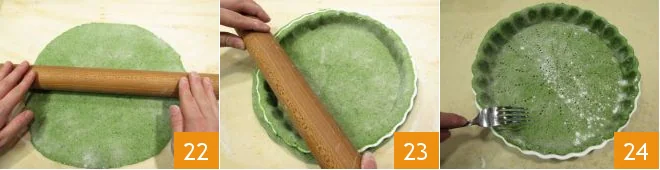 After two hours, take the shortcrust pastry dough and roll it out on the work surface to a thickness of half an inch 22. Butter a 10-inch diameter mold and line it with the rolled-out pastry 23. Prick the bottom with a fork 34.
