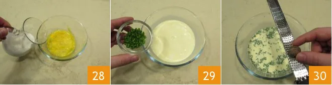Now prepare a sauce to cover the tricolor savory pie: beat the cream together with the eggs in a bowl 28, then salt, pepper, add the finely chopped chives 29 and grated nutmeg 30.