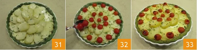 Proceed with the first layer by arranging the zucchini to cover the base 25, then proceed with a layer of peas 26, and finally finish the tricolor savory pie by laying the potatoes 27.
