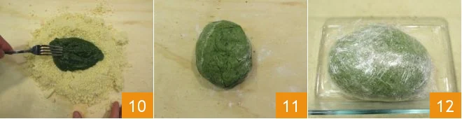 Transfer the butter and flour mixture to a work surface and add the spinach puree 10. Work quickly with your hands, so as not to warm the ingredients, until you have a homogeneous mixture 11. Form a dough ball, wrap it in cling film, and place it in the fridge for at least two hours until it is firm 12.
